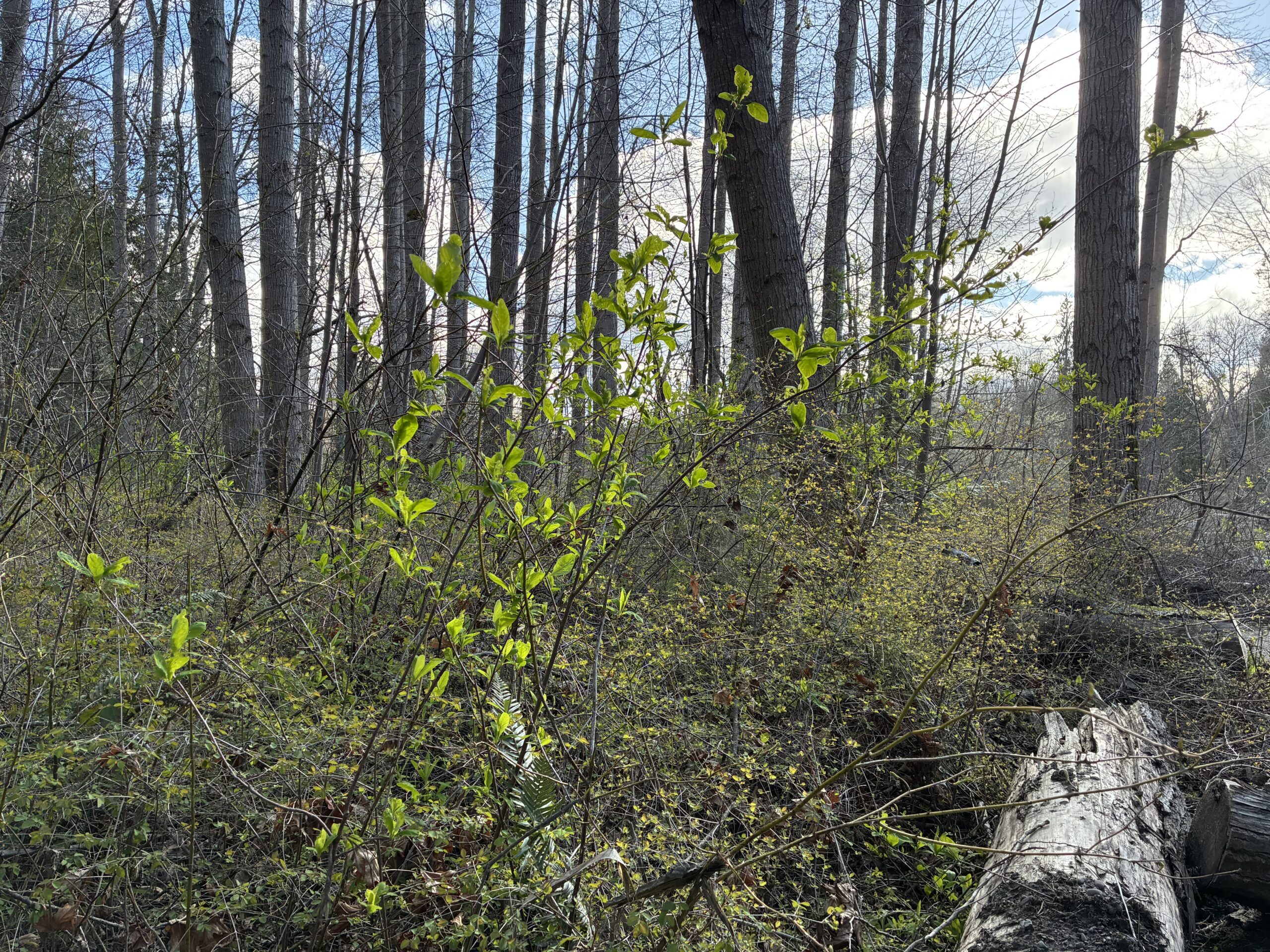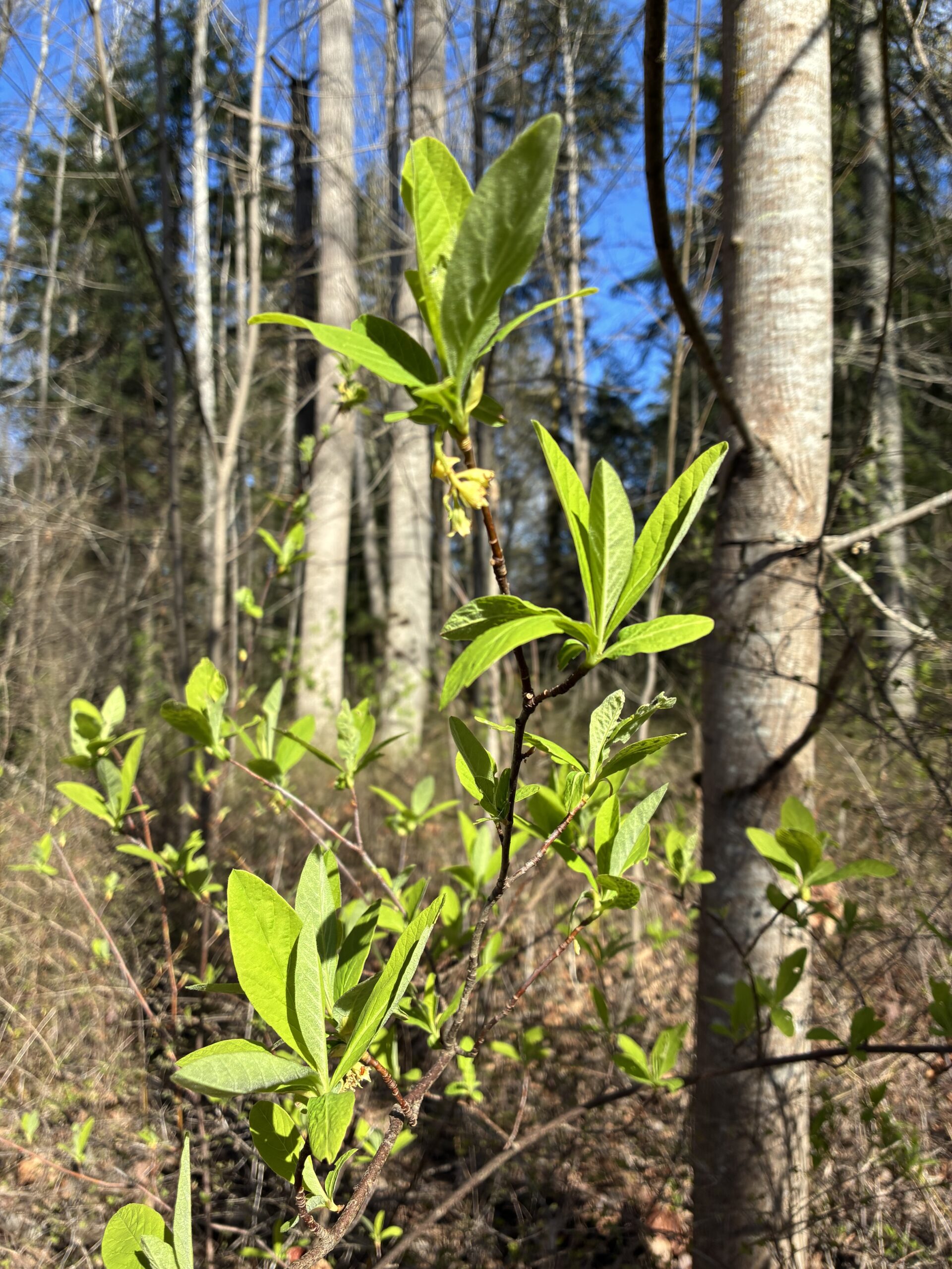 Have you seen these dashes of bright green out on our trails lately? These are the budding leaves of osoberry (Oemleria cerasiformis), or Indian Plum, a shrub native to the Pacific coast of North America. Budding in late winter, osoberry is one of the earliest plants to return from dormancy each year. The emergence of its narrow, lance-shaped leaves across our landscape is one of the first signs of spring here in the Pacific Northwest. It’s one of the earliest to bloom as well, so be on the lookout for its pretty clusters of greenish-white blossoms as the weather continues to warm!
